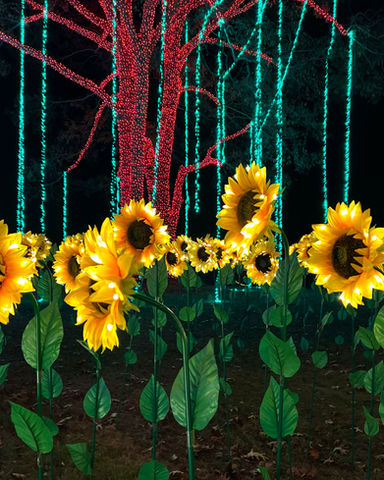 Our roughly one-mile trail winds through 14 acres of Enchanting Hardwood Forest. Most of the trail is on gentle, rolling terrain with a few moderate elevation changes. It will take about an hour to see everything. You will be able to go around at your own pace. The Light Displays and Exhibits are Illuminating, Immersive, Awesome, and some are Interactive so that you can walk through them and experience them up close.